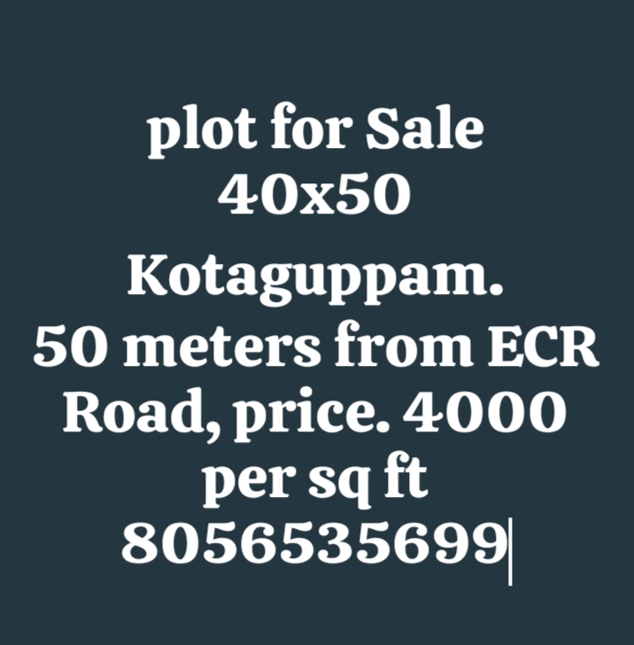 🏡 PLOT FOR SALE – KOTAGUPPAM (Near ECR Road)📐 Plot Size: 40 × 50 (2000 Sq.ft)📍 Location: Kotaguppam🛣️ Distance: Just 50 meters from ECR Road💰 Price: ₹4,000 per Sq.ft (Negotiable)✨ Highlights:✔ Prime location✔ Easy access to ECR Road✔ Ideal for house / investment✔ Clear title📞 Contact: 80565 35699(Serious buyers only)
